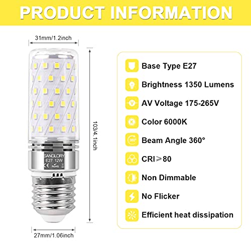SanGlory 2 Pezzi Lampadine LED E27 Luce Fredda, 12W Equivalenti a 100W, 1350LM, 6000K Bianca Fredda, E27 Lampadine LED Mais, Angolo 360°, Risparmio Energetico, Non Dimmerabile