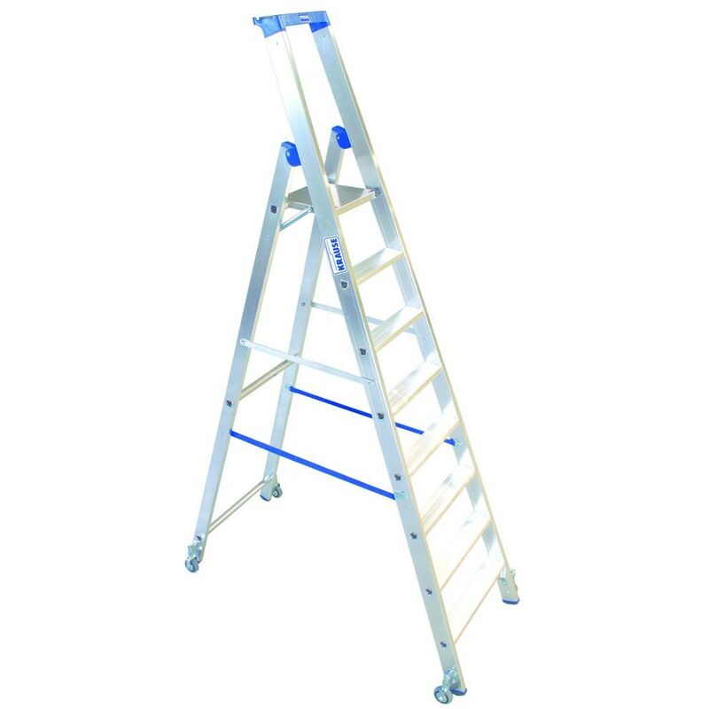 Il telaio in alluminio con 4 ruote integrate è progettato per l'uso mobile. il dispositivo di sicurezza da tirare e spingere, la piattaforma di sicurezza dei profili in alluminio antiscivolo e il cilindro della piattaforma su entrambi i lati garantiscono una facile gestione dello sgabello e una posizione di sicurezza. È inoltre dotato di una barra di alta sicurezza con vassoio per utensili a bullone, un gancio per l'acqua integrato e giunzioni ben attaccate. i raccordi angolo avvitato garantiscono grande stabilità. Inoltre, l'escabeau è dotato di cinghie bulloni e resistenti agli agenti atmosferici, cucite in lembi metallici. Modello modello: 8 passi