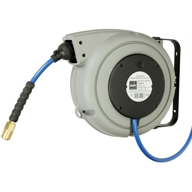 Avvolgitubo automatico - SLA 8-10 A Per una maggiore ergonomia sul posto di lavoro Tubo flessibile per aria compressa elastico e resistente all'abrasione con molla antipiega e dispositivo di arresto del tubo flessibile Alloggiamento in plastica e staffa a muro in acciaio Con staffa girevole (210°) Caratteristiche comuni Migliori risultati di lavoro grazie all'elevata portata d'aria di 330 l/min Pronto per il collegamento e completamente equipaggiato con attacco rapido e tubo di collegamento lungo con nipplo a innesto Elevata flessibilità durante l'installazione e il lavoro grazie al lungo tubo di collegamento (1,5 m) Adatto per il montaggio a parete e a soffitto Dati tecnici Pressione massima 15 bar Ø esterno 12 mm Ø interno 8 mm Estensibile Lunghezza 10 m Peso 4 kg
