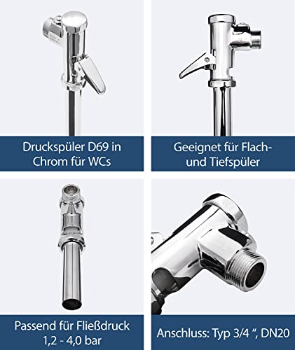 ➤ Lavastoviglie a pressione NIL D 69: Per tutti i WC piatti e profondi Risparmio d'acqua Connettore: DN20 3/4 innesco meccanico Pressione di flusso: 1,2 - 4,0 bar Tubo di scarico: Ø 28 X Ø 26 mm Raccordo saldato (DIN 3265) Cromatura di alta qualità