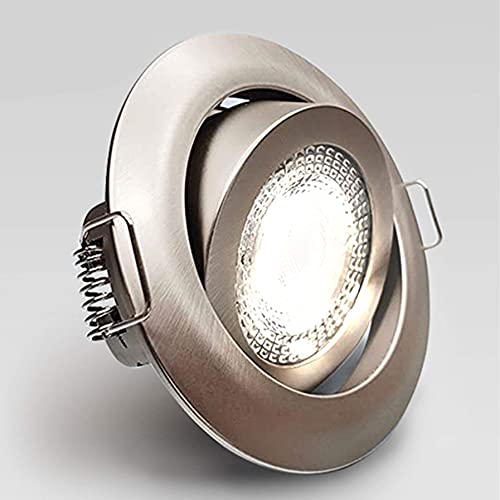 Questo downlight completamente integrato è costituito da diversi chip LED di alta qualità e fornisce gli stessi 450 lumen di luce che fa un alogeno da 50 W. A+consumo di energia significa circa il 90% di energia risparmiata. Può essere ruotato da 30 gradi ed emette luce bianca fredda con un angolo di 100 gradi. L'uso flessibile è possibile nelle aree di vita e di lavoro in cui non è richiesta la valutazione antincendio.