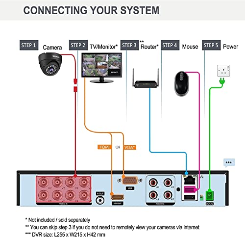 【Facile configurazione e P2P】Collega fotocamere, monitor e router a DVR, quindi accendi telecamere e DVR per scopi di sorveglianza 24/7. Il DVR supporta l'anteprima video, la registrazione, la sincronizzazione, il backup (bisogno di un disco rigido aggiuntivo per la registrazione e la riproduzione). Questo sistema 1080P potrebbe non supportare alcuni vecchi televisori/monitor con risoluzione molto bassa, assicurarsi che i televisori/monitor supportino l'uscita @1920x1080 pixel (minimo 1080p). Non utilizzare computer portatile o iMac come monitor.