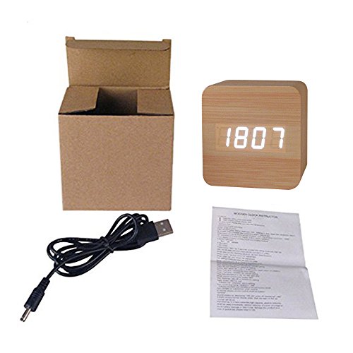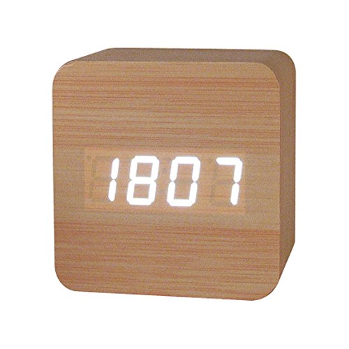 SanSiDo Orologio digitale, con sveglia, impermeabile, in legno, con controllo del suono, display con illuminazione LED, indicazione della temperatura, complemento d'arredo per la casa e l'ufficio Wood & White