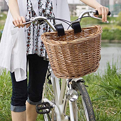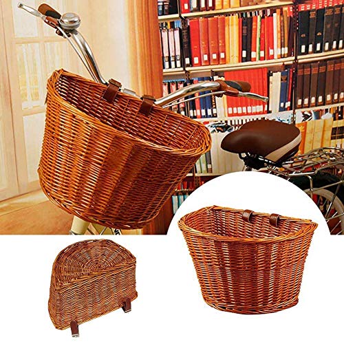Sansund - Cestino per bicicletta in vimini a forma di D, portatile, intrecciato a mano, con cinghie in pelle, artigianato popolare, Marrone, medium