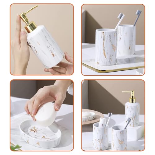 Santentre 4 pezzi Lusso Ceramica Set di accessori per il bagno con erogatore di sapone, porta spazzolino da denti, bicchiere, Detersivo per i piatti, Regalo per Organizzazione, Effetto marmo bianco