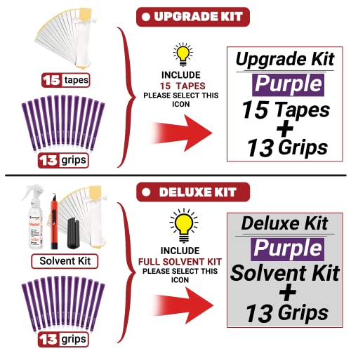 2 kit opzionali: il kit attuale è Deluxe, tra cui 13 impugnature e 15 nastri di presa, solvente da 5 oz, morsetto in gomma e lama a gancio. Il nastro è strisce di nastro a striscia, è un nuovo tipo di nastro da golf che abbiamo sviluppato che funzionerà meglio con il nostro solvente SAPLIZE. Facile da sbucciare e non si accumula durante l'installazione.