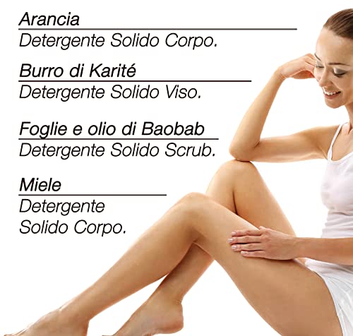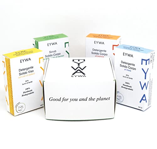 EYWA Kit 4 Saponi Solidi Detergenza Viso Corpo e Scrub Corpo. Prodotti Naturali Plastic Free Fairtrade: 50% Karité, Olio di Dattero, Olio di Baobab, Olio di Cocco, Miele e Arancia.