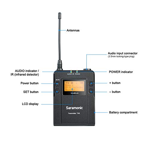 Saramonico Uwmic9 UHF Wireless Lavalier Microphone System 96 canali Clip omnidirezionale su microfono con risvolto per fotocamere DSLR Nikon, Canon, Panasonic, videocamera per intervista, ENG, TV