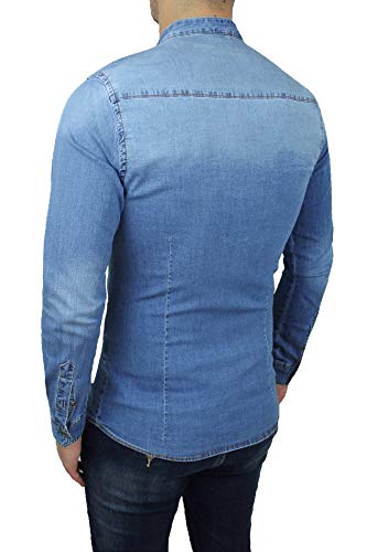 Mat Sartoriale Camicia di Jeans Uomo Blu Denim Slim Fit con Colletto alla Coreana (M, Blu Chiaro)
