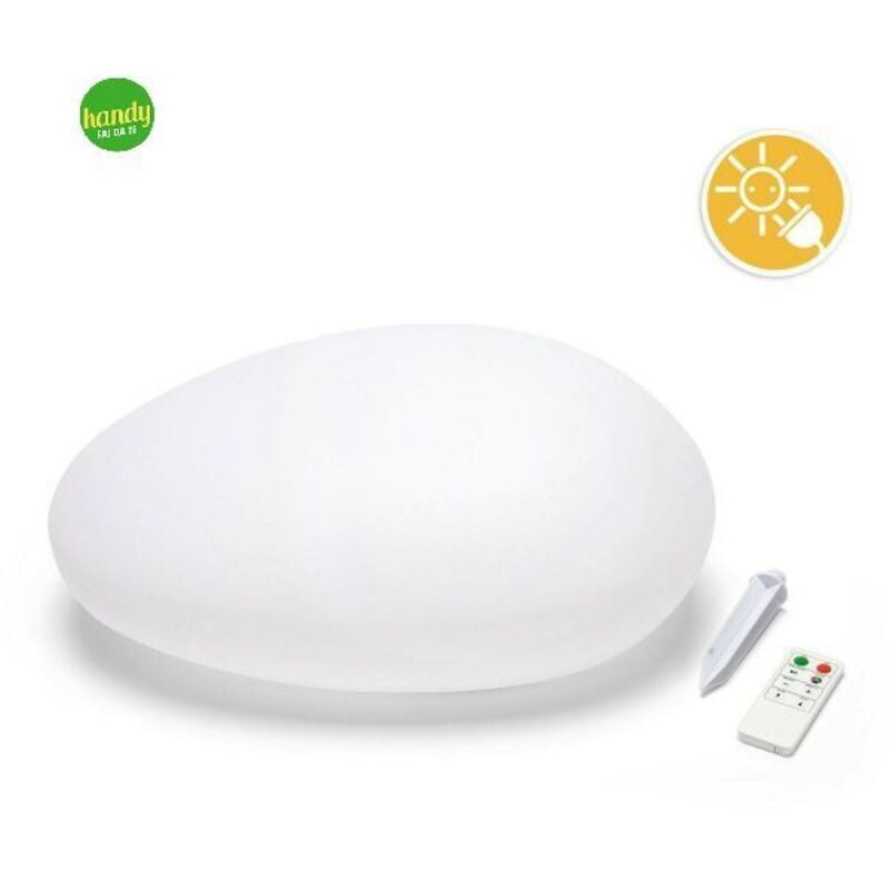 Sasso luminoso LED RGB a ricarica solare 40cm, IP66, con telecomando. Scelta tra bianco e 7 colori. Wireless. Per giardino, terrazzo, piscina. Designsemplice, adatto sia allo stile di vita moderno che a quello classico: il sasso luminoso è un classico del design dell'illuminazione. Versatile utilizzo ad esempio in giardino, sulla terrazza, nel giardino d'inverno, nella zona giorno, nelle fiere e nelle mostre, nella vetrina e molto altro ancora.può essere installato come apparecchio singolo o in gruppo. Sasso luminoso led a ricarica solare che si accende e si spegne autonomamente: si accenderà automaticamente al buio e si spegnerà per ricaricarsi durante il giorno. Munito di led RGB vi darà una luce bianca calda con temperatura di colore di 3.000 Kelvin, ma offre anche 7 colori a scelta selezionabili tramite il telecomando in dotazione (rosso, verde, blu, giallo, viola, ciano, rosa). La luminosità è di 30 lumen. Lo potrete usare all'esterno (grazie al grado di protezione IP66) o