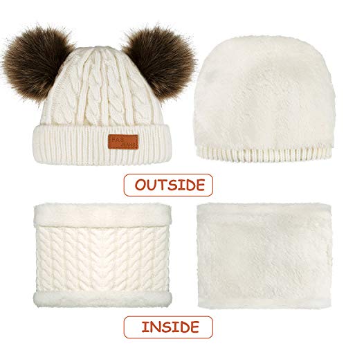 SATINIOR 3 Pezzi Bambino Inverno Caldo Set Berretto Cappello con Doppio Pom Pom Bambini Sciarpa Guanti a Maglia (Bianco)