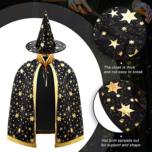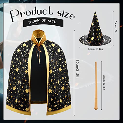SATINIOR 3 Pezzi Costumi da Mago di Halloween Mantello del Mago Strega con Cappello Bacchetta Magica Luminosa e Sonore per Bambini Ragazzi Travestimenti da Cosplay (Nero e Oro)