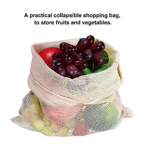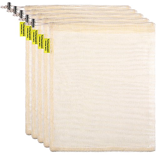 SATINIOR 5 Pezzi Sacchetti di Prodotti Riutilizzabili con Chiusura a Coulisse, Borse Shopping a Maglia Respirabile, Tara Peso su Etichetta, Sacchetto di Cotone Naturale (13 x 11 Pollici)