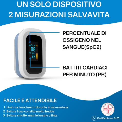 Saturimetro da dito professionale certificato CE no. 0123 - Registrato al Ministero della Salute Italiana - Pulsossimetro da dito Semplice e Affidabile - Saturimetro da dito professionale certificato per uso Domestico e Sportivo