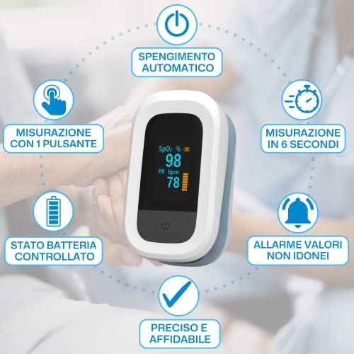 Saturimetro da dito per Adulti, Anziani e Mancini -Saturimetro professionale con Allarme per Valori non idonei - Stato della batteria del saturimetro prolungata grazie allo spegnimento automatico