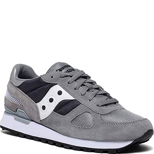 Sneakers uomo Saucony in tela e camoscio grigio. Talloncino grigio. Banda laterale bianca. Lacci in cotone grigio o bianco. Fondo in gomma bianco.