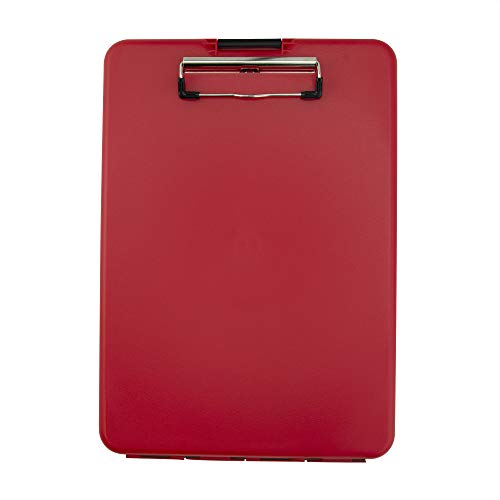 Low-profile polypropylene clipboard with top-opening storage compartment, spring clip and snap closure.