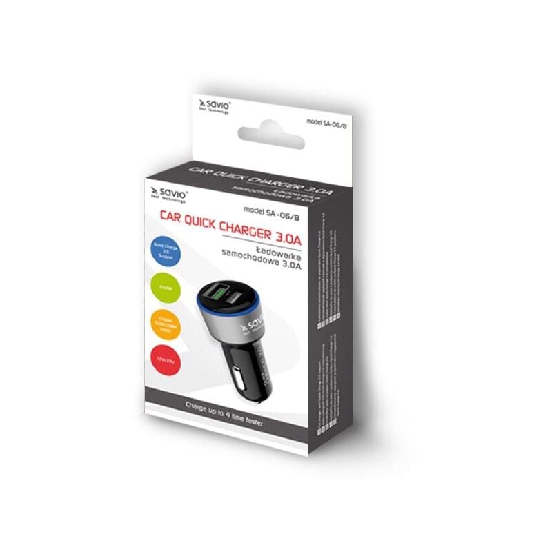 Savio SA-06/B. Tipo di caricatore: Esterno, Alimentazione: Accendisigari de, Compatibilità of caricatore: Smartphone. Colore delprodotto: Nero
