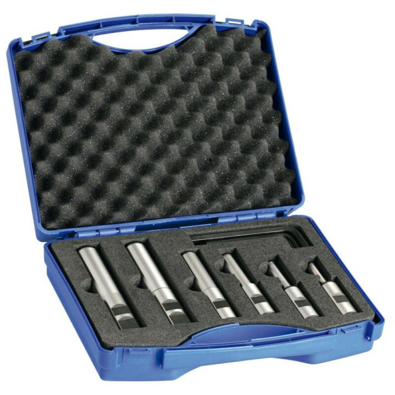 Set di porta-lame - Gambo secondo DIN 1835-B - Con vite di serraggio e anello intermedio - Per il fissaggio in mandrini di superficie - Per il fissaggio di lame circolari in metallo Consegna: in valigetta di plastica. Contenuto: 6 porta-lame da 20;