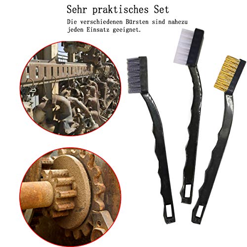Sayago Set di 9 spazzole in filo metallico con setole in acciaio inox ottone e nylon, manico curvo per la pulizia di residui di saldatura e ruggine, 2 pezzi per tipo (9 pezzi di spazzola metallica)