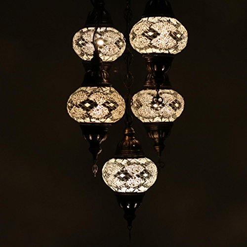 Sbalorditiva lampada turca Lampada appesa mosaicata, lampadario turco multicolor fatta a mano con mosaici in stile marocchino e ottomano con 5 globi di taglia media.