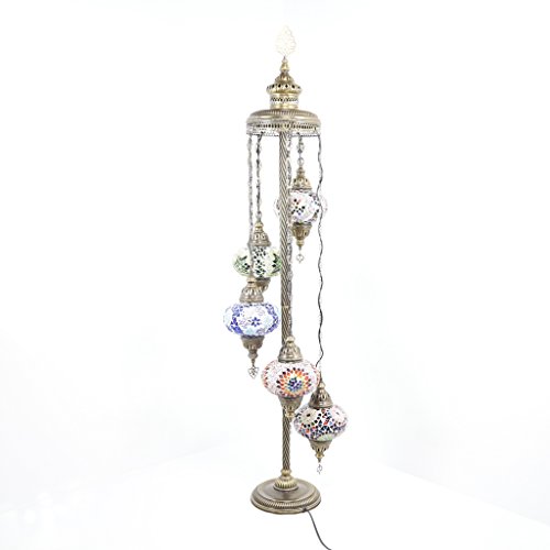 Sbalorditiva lampade turche da pavimento mosaicate, lampada turca da pavimento multicolor fatta a mano con mosaici in stile marocchino con 5 globi di taglia grande.