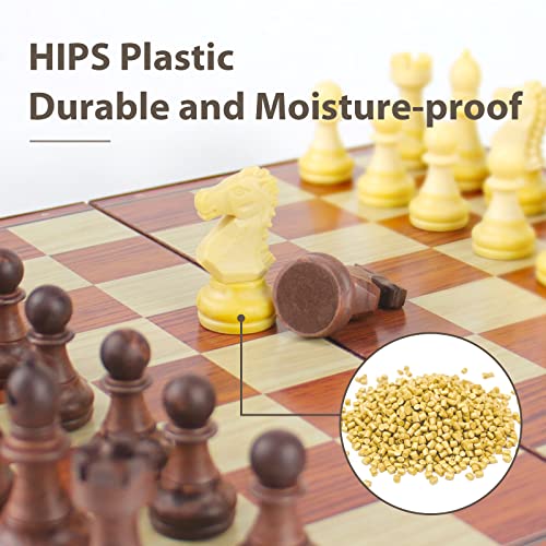 ♗PLASTICA MAGNETICA COLORE LEGNO: questo set di scacchi non è realizzato in legno, considerando che il materiale in legno è pesante e facile da inumidire e marcire, utilizziamo plastica composita HIPS ecologica e sicura con il colore del legno. La plastica è più leggera, resistente all'umidità e durevole.