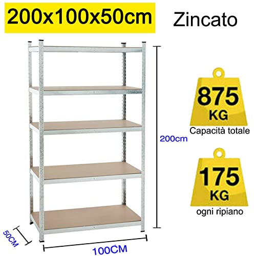 Scaffalatura Garage 200cm x 100cm x 50cm, Scaffalatura metallo Robusto Scaffalatura a 5 Ripiani, Facile da Montare, Portata 875 kg, Colore: Zincato