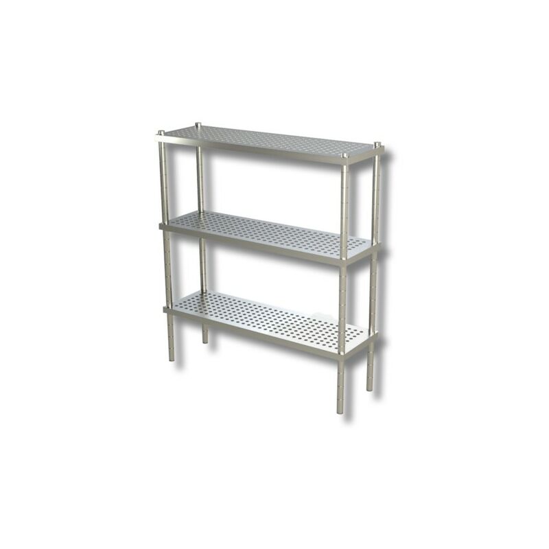 Codice RS7985 - Scaffalatura 3 ripiani forati modello RP-DSSCFE10515, dimensioni cm. 100x50x150 (lxpxh), altezza totale cm. 150. Realizzazione in acciaio inox, gambe tonde. Fornito in kit smontato.