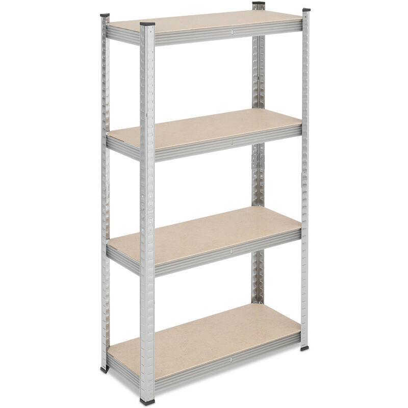 Questo scaffale ad altaportata offre molto spazio per mettere in ordine ed è ideale per sopportareanche grandi pesi. Ad esempio come mobile in cantina, in officina, in garage, nelladispensa o nel capanno in giardino. Riponi sulle mensole pneumatici,macchinari, attrezzi e altri oggetti pesanti. Puoi montare i 4 ripiani in altezze variabili a seconda delle tue esigenze. Se necessario puoianche dividere la scaffalatura al centro e avere così 2 scaffali più bassi. Consiglio: il pratico sistema a incastro non necessita di attrezzi per in montaggio facile e veloce. Potrebbe essere necessario un martello in gomma. Assemblare lo scaffale indossando un paio di guanti da lavoro. Scaffalatura per il garage in dettaglio - Dimensioni totali H x L x P: 138 x 70 x 30 cm ca. - Capacità di carico totale: 200 kg ca. - Carico max per ripiano: 50 kg ca. - Dimensioni superficie L x P: 69 x 29 cm ca. - Spessore di ogni piano in MDF: 4 mm ca. - Peso: 6,1 kg ca. - Materiale: MDF, acciaio zincato, plastica