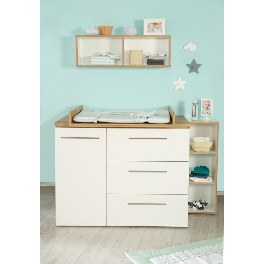 Il ripiano laterale Finn del roba si inserisce perfettamente sotto il fasciatoio Finn. Lo stretto scaffale in piedi con 3 scomparti crea un ulteriore spazio di stoccaggio accanto alla zona per il cambio dei pannolini nella stanza del bambino. In alternativa, il ripiano può essere semplicemente spinto nello spazio libero dietro il cambia pannolini, in modo da chiudere la fessura creata dall'attacco più profondo del cambia pannolini tra il muro e l'unità. In questo modo, ad esempio, si può creare un grande centro per il cambio dei pannolini con tanto spazio di archiviazione in un angolo di una stanza. Due scaffali offrono spazio per il cambio di utensili e pannolini e avete tutto a portata di mano quando vi occupate del vostro bambino. Un'altra pratica aggiunta al fasciatoio con ripiano laterale è il ripiano a muro coordinato della serie Finn. Con i mobili per bambini della serie Finn è possibile arredare una cameretta per bambini o neonati in stile con mobili di sistema che crescono con il bambino. Lo scaffale laterale roba vi servirà per molti anni. Più tardi, quando il vostro bambino è più grande, il fasciatoio può essere utilizzato come libreria in soggiorno o nella nursery. Il ripiano laterale Finn è stato prodotto nell'UE ed è facile da montare. Inoltre, è certificato eph e porta il marchio di qualità Blue Angel, che garantisce che tutti i materiali utilizzati soddisfano i più alti standard di proprietà ambientali, sanitarie e di utilizzo. dettagli del prodotto: Colore corpo: bianco Colore bordi esterni: quercia dorata Materiale corpo: truciolato, rivestito in melamina Materiale pannello posteriore: MDF Dimensioni: larghezza x profondità x altezza 32 cm x 30 cm x 92 cm 2 ripiani
