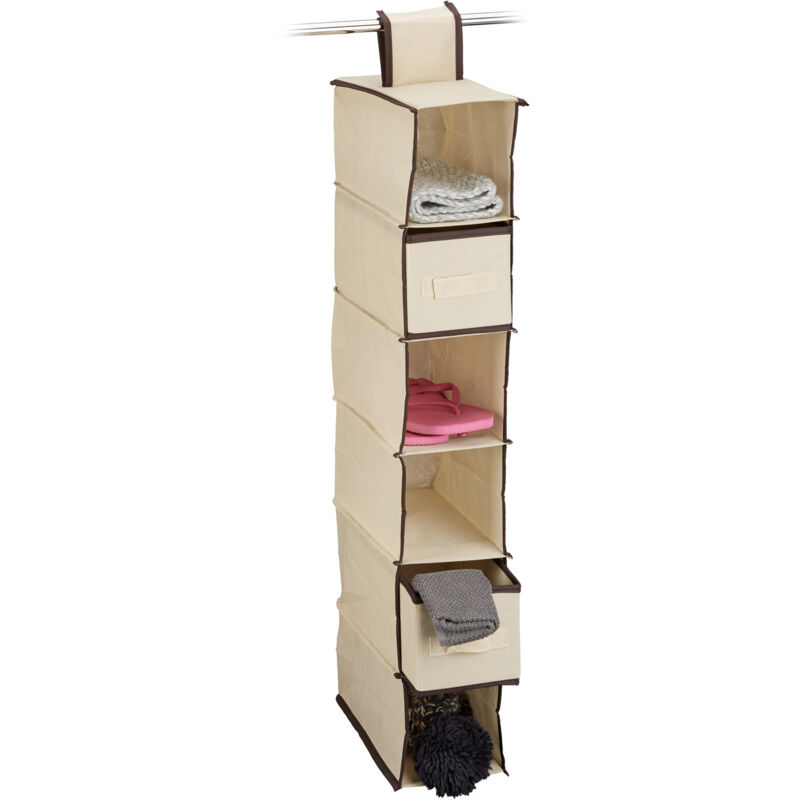 Questo scaffale mette finalmente ordine nel vostro guardaroba. Grazie alla misura universale si può collegare facilmente a quasi tutti gli armadi/guardaroba. Questo ripiano a sospensione e´ realizzato in tessuto resistente, ha 6 scomparti per vestiti, scarpe e altri piccoli accessori. I 2 alloggiamenti aggiuntivi sono particolarmente adatti per capi/oggetti che non dovrebbero essere visualizzati dall'esterno. Questo ripiano appeso nel vostro armadio fa una bella figura, oltre ad essere un compagno utile. Ideale anche in bagno e può essere ripiegato rapidamente quando non vi serve piu´. Ideale anche per le vostre prossime vacanze. Dettagli principali prodotto - Dimensioni H x L x P: circa 82 x 14,5 x 30 cm - 6 scomparti (interni) H x L x P: 13,5 x 13,5 x 29 cm - Dimensioni interne con cassetti chiusi H x L x P: 13 x 13 x 28,5 cm - Capacità di carico max. ciascun ripiano: 1 kg - Totale volume di 26 litri - Materiale: TNT - Rinforzo in cartone Pratico scaffale - In beige - Per lo