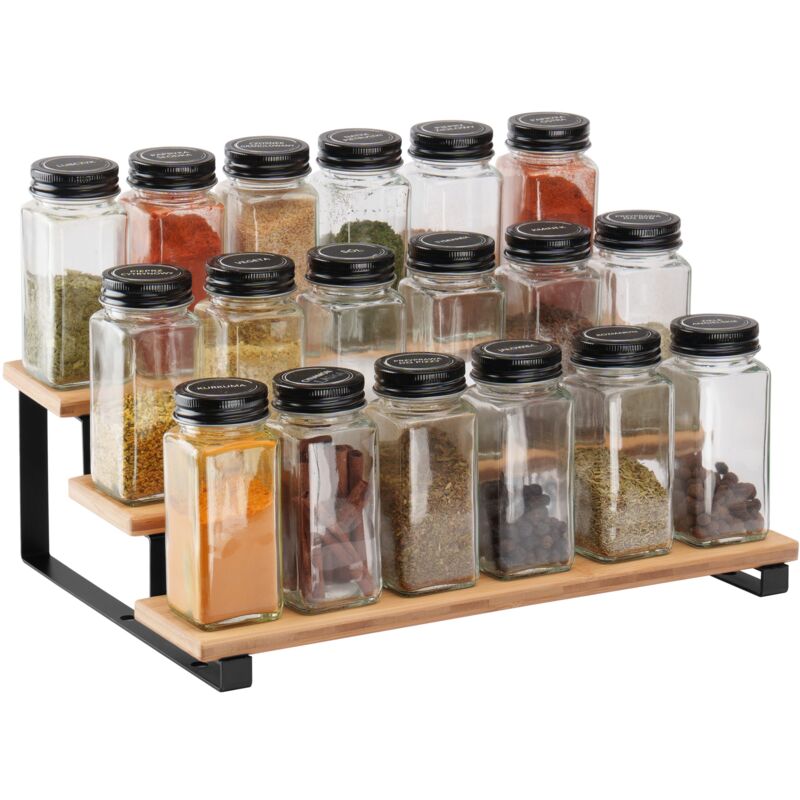 DRACO scaffale portaspezie, organizer da cucina, 3 livelli Destinazione d'uso: cucina, ufficio | Colori: bambù naturale Scopri l'elegante e funzionale set di mensole Ginger, l'aggiunta perfetta alla tua cucina. Questo set di due scaffali è stato creato per chi cerca una combinazione di praticità e look moderno. Il set è caratterizzato da materiali di ottima qualità e offre ampie possibilità di disposizione. I ripiani, realizzati in legno di bambù ecologico e una struttura in acciaio resistente ai danni rivestita con verniciatura a polvere nera opaca, aggiungono un tocco di eleganza agli interni. I ripiani hanno la stessa larghezza, ma uno è leggermente più alto, così puoi creare innumerevoli composizioni! Il design degli scaffali consente una varietà di impostazioni: puoi posizionarli uno accanto all'altro, uno sopra l'altro, disporli a forma di lettera "L" o far scorrere uno scaffale più piccolo nella cornice di uno più grande uno, che consente un uso efficiente dello spazio. ⬇️In