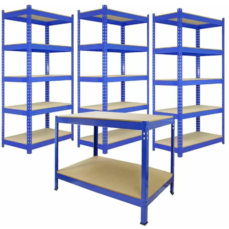 Scaffali Set 3 Scaffali ad Incastro con Banco da lavoro da 120 cm Piani in MDF Struttura in Acciaio Blu Scaffali e banchi perfetti per il tuo garage, magazzino, serra o officina grazie alla loro versatilità e robustezza che hanno una portata impressionante in rapporto alla loro dimensione. Assemblaggio ad incastro con perni a serratura senza bulloni, montaggio facile con il solo uso di un martello di gomma. Inoltre, i ripiani possono essere regolati ad altezza a piacere per la massima modularità. Con solidi mensole a pannelli in MDF e piedini vulcanizzati per stabilità extra, gli scaffali e i banchi da lavoro Q-Rax sostengono un generoso peso per unità! Nota: l'MDF incluso in tutte le nostre scaffalature e banchi da lavoro non è trattato. Consigliamo ai clienti di trattare ogni tavola prima di utilizzarla in ambienti freddi o umidi. Caratteristiche Tecniche Questo scaffale è al 100% senza bulloni, facile da montare, i pezzi si incastrano in poizione con un martello di gomma Rifinito