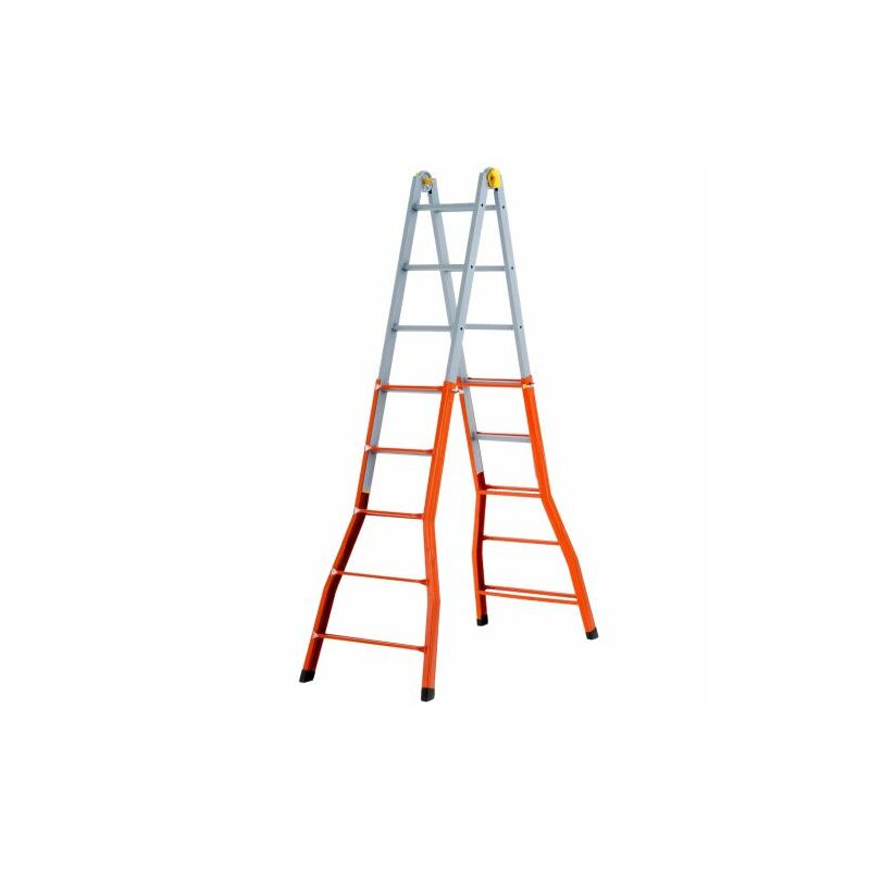 In acciaio saldato, verniciato con polveri epossidiche. Con cerniera automatica di sicurezza. Sezione montanti interno mm 50x20 Sezione montante esterno mm 55x25 Portata 100 kg A norma europea EN 131 5+5 gradini Altezza chiusa 139 cm Altezza a for