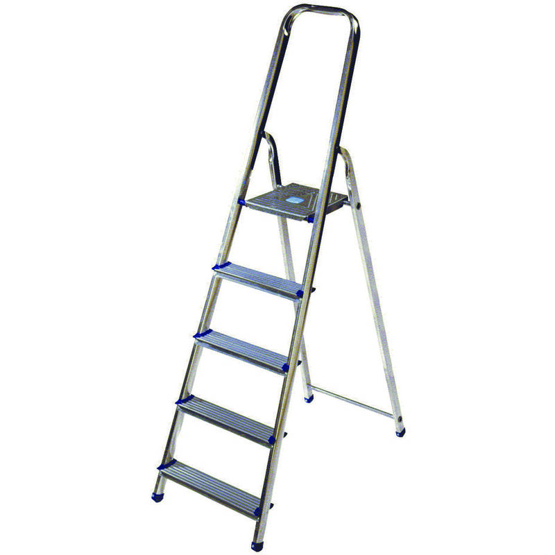 Scala domestica in alluminio con paracorpo ad arco chiuso costruita rispettando precisi criteri previsti dal D.Lgs 81/08 - portata max kg.100 - solida leggera e maneggevole - pedana in acciaio verniciato - montanti anteriori mm.40x20 - montanti retro mm.35x20 - antiscivolo da mm.80 con doppi rivetti - pedana cm.25,8x26,4