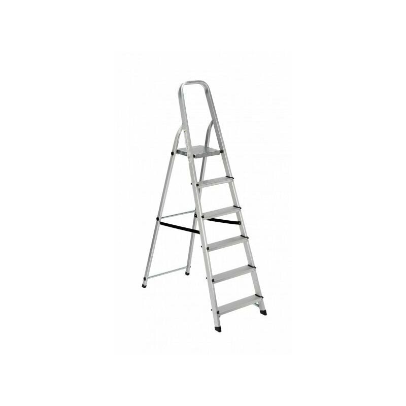 Scala in alluminio Fredi Revete Caratteristiche: Scala a 6 gradini Adatta ad Uso domestico fettuccia antidivarcamento Gancio di sicurezza Piedi con tappi antiscivolo Richiudibile Gradini antisdrucciolo ( antiscivolo) Portata massima 150 kg Misure: 105x47x172h cm ( L'altezza è intesa come altezza dell'ingombro massimo della scala quindi compresa anche la curva in alluminio ).