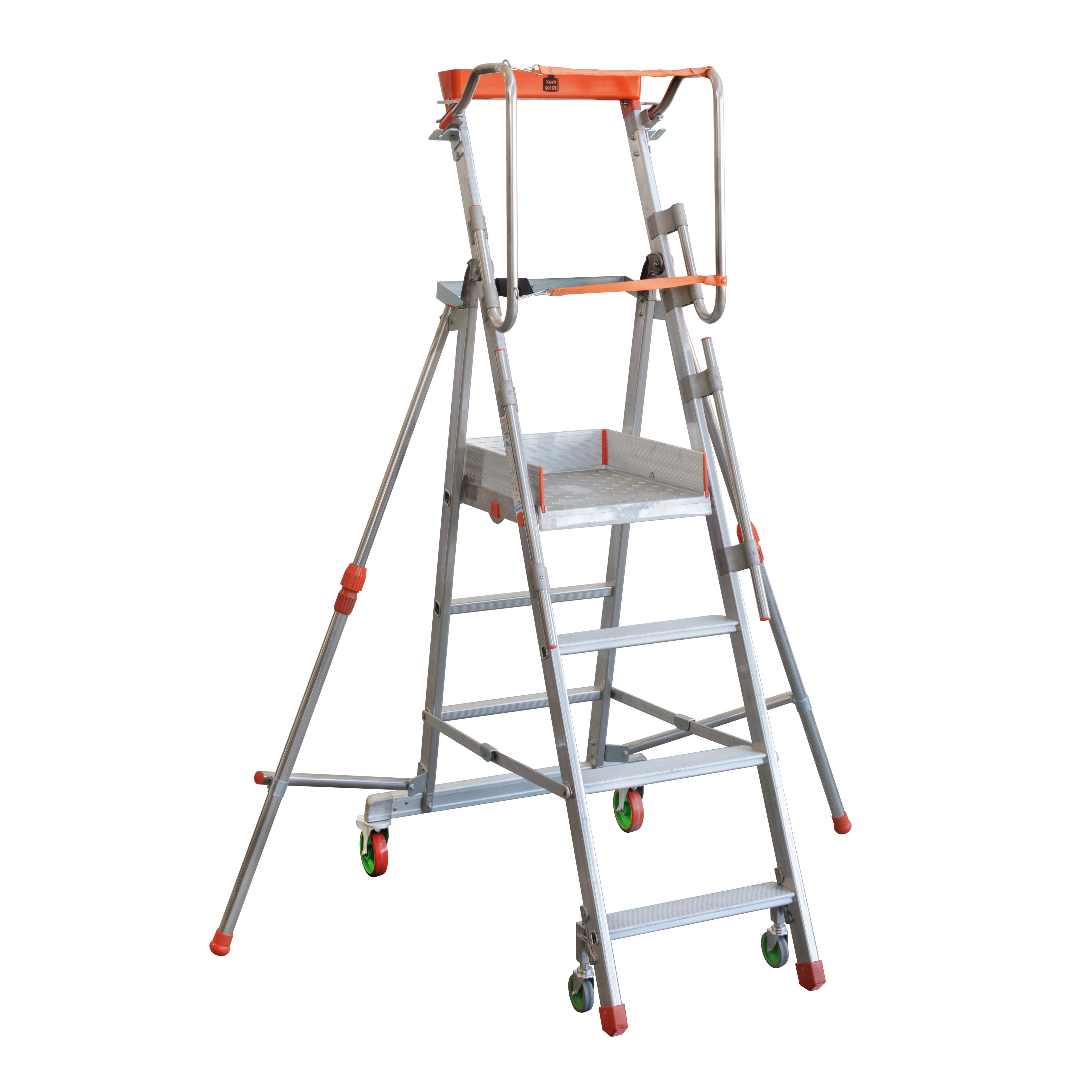 Conforme a UNI EN 131, EN121-1/2/3/7. Ideale per lavori in ambienti interni ed esterni. La struttura in alluminio rende la scala resistente, leggera e facile da trasportare. Grazie alla barra stabilizzatrice puoi lavorare con stabilità su superfici differenti