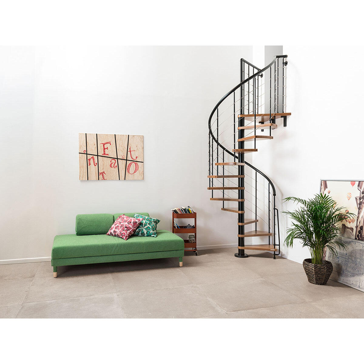 La scala a chiocciola SIMPHONIE è realizzata combinando i colori dell'acciaio con i gradini in massello di faggio, con una proposta di tonalità che soddisfa tutti le esigente delle attuali abitazioni. E' dotata di un corrimano in PVC abbinato al colore della struttura della scala: Grazie alla sua modularità e flessibilità, il senso di rotazione della scala può essere stabilito in fase di posa. La ringhiera è composta da colonnine di acciaio verniciato collegate da 5 TOND in acciaio inox. I diametri disponibili sono 120, 140 e 160 cm.. Scala prefabbricata, facile da montare per chi ama fai da te.. La soluzione ideale per sfruttare al meglio gli spazi grazie al ridotto ingombro della superficie a terra. La sua forma circolare è indicata sia per fori quadrati che rotondi. Ideale per ambienti interni in stile contemporaneo