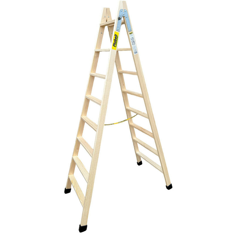 Scala de in legno a pioli larghi 214cm alta bld-8 plabell. speciale per imbianchini ed elettricisti, de uso esclusivo a forbice e de doppia salita. con pioli larghi, de 7cm, e montanti de sezione piramidale sulla sua larghezza totale, progressivamente allungati verso l'alto in direzione della base. in cima, oltre al sistema antiapertura, i gradini formano una struttura di tipo de per accogliere tutti i tipi de di materiali e contenitori. per garantire la stabilità de della scala, è inoltre dotata di gommini antiscivolo e nastro antiapertura. dimensioni: 214x31/62cm. numero di pioli: 8+8. peso della scala: 8kg. garanzia di 2 anni. norma ue en 131-1-2.