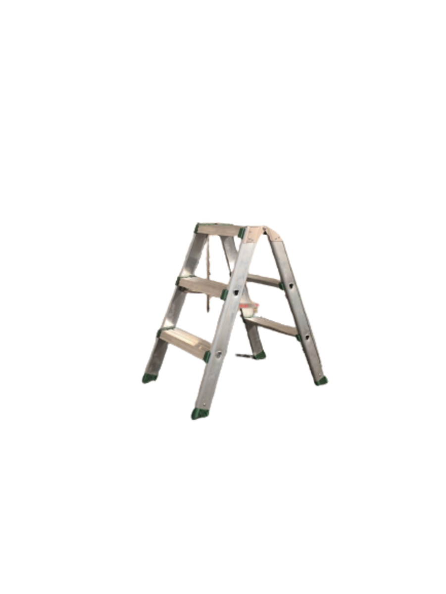 Scala professionale a 3 gradini in alluminio estruso a doppia salita.. Montante ergonomico, cerniere completamente realizzate in alluminio. Piedini a doppia inclinazione. Gradini passanti, ribattuti nel montante. Coprigradini integrati nel profilo della scala. Sezione profilo montante 62x21 mm. Sezione gradino 80 mm. Portata massima 150 kg. Normativa EN 131.