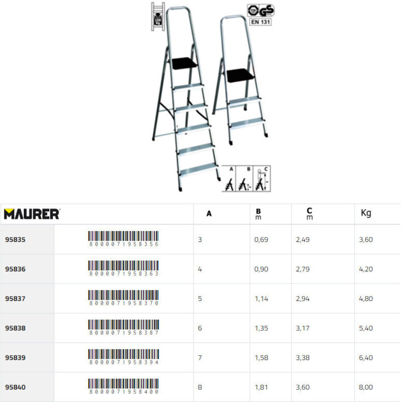 35x20 mm. - Gradini antisdrucciolo profondi 80 mm. con doppi rivetti sul davanti - Portata max 150 kg. - Garanzia 5 anni - Made in Italy 100% - Norme EN131 Gradini: 8 H Piattaforma: 1,79 mt Peso: 7,60 kg