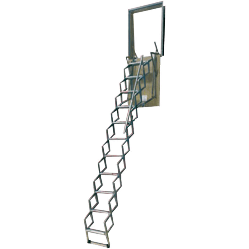 In lamiera stampata, munita di corrimano telescopico. La parte superiore della scala è ancorata ad un telaio di lamiera dello spessore di 1,2 mm. Gradino cm 34. Portata 150 kg.