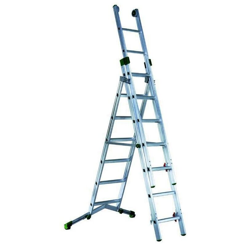 PRIMA trasformabile è scala professionale in alluminio a due oppure tre rampe di elevato livello tecnico idonea per uso intensivo. Ampi montanti riducono al minimo le flessioni ed i pioli 30x30 mm a sezione romboidale inclinati di 68° garantiscono l'appoggio dei piedi in piano, quindi il non affaticamento delle gambe (brevetto). La barra stabilizzatrice telescopica saldata è sempre sollevata da terra, regolabile al terreno ed esprime massima tecnologia. La barra telescopica è integrata alla scala, mai da montare a parte. PRIMA è un progetto mirato ad offrire al mercato un prodotto superiore ad ogni paragone. È scala capace di porsi sempre in condizioni di perfetta stabilità e di adattarsi ad ogni situazione ambientale anche la più sfavorevole quali pendenze, falsipiani o dossi. Le cerniere d'alluminio fuso permettono l'apertura anche a cavalletto in posizione di “zoppo”. Ha 8+9 gradini, ed altezza di 294/480 cm. Serie Super Prima, linea Verde, marchio Facal