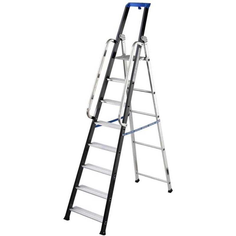 In alluminio. Adatta per lavori professionali. Robusta e stabile, è dotata di una comoda vaschetta porta utensili e supporto per appendere secchi e contenitori. Gradino zigrinato da 110 mm con profilo stondato, struttura portante in tubolare. Piedini in gomma antiscivolo zigrinati. Certificazione a norma EN131, portata 150 kg.