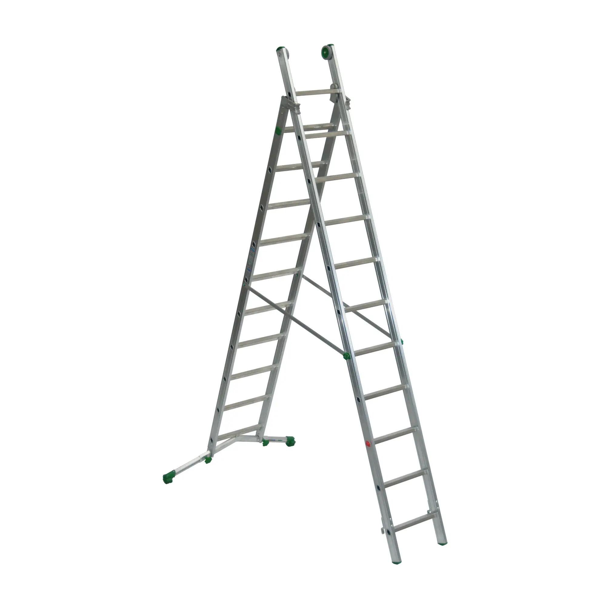 Conforme a UNI EN 131. Ideale per lavori in ambienti interni ed esterni. La struttura in alluminio rende la scala resistente, leggera e facile da trasportare. Grazie alla barra stabilizzatrice puoi lavorare con stabilità su superfici differenti