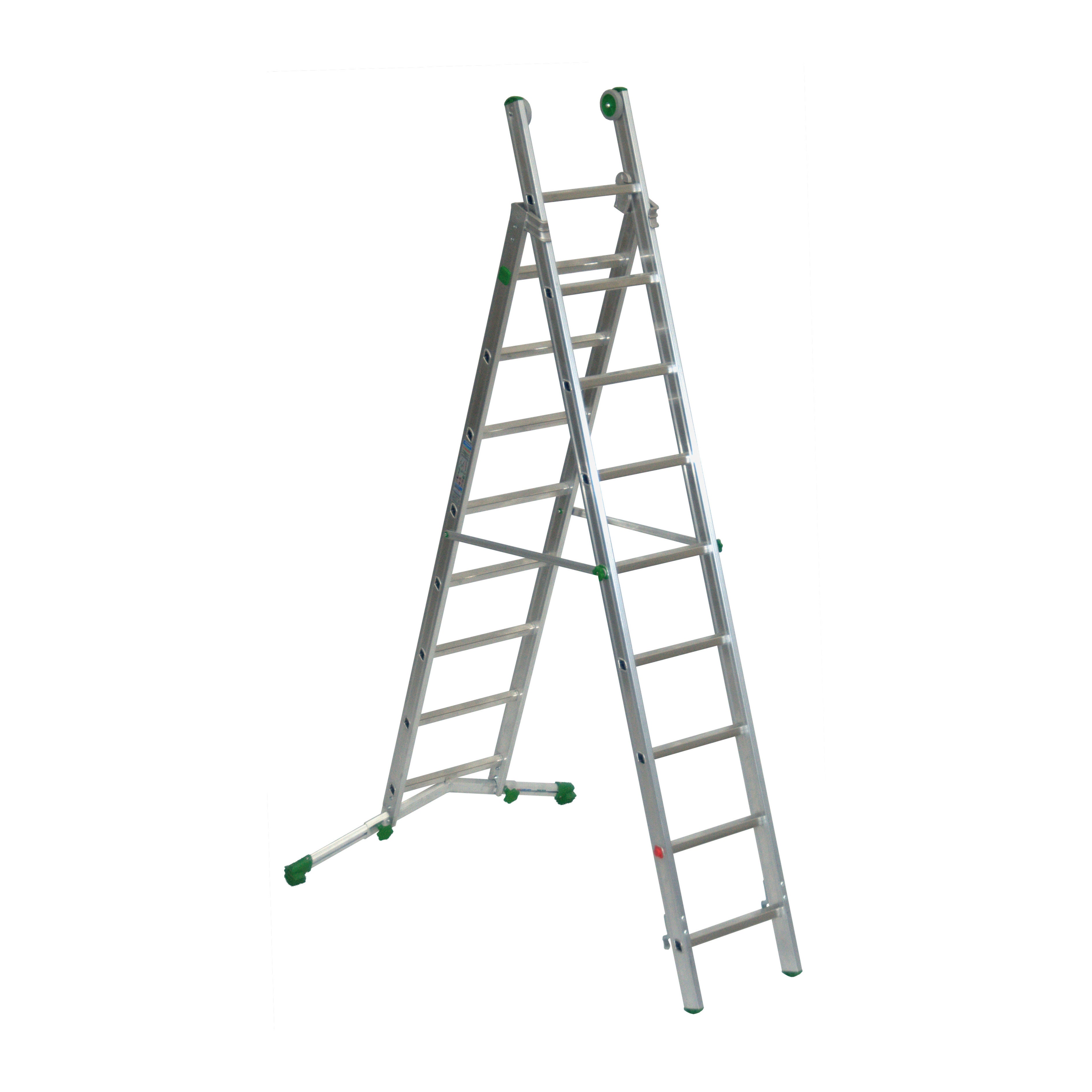 Conforme a UNI EN 131. Ideale per uso professionale. La struttura in alluminio rende la scala resistente, leggera e facile da trasportare. Grazie alla barra stabilizzatrice puoi lavorare con stabilità su superfici differenti