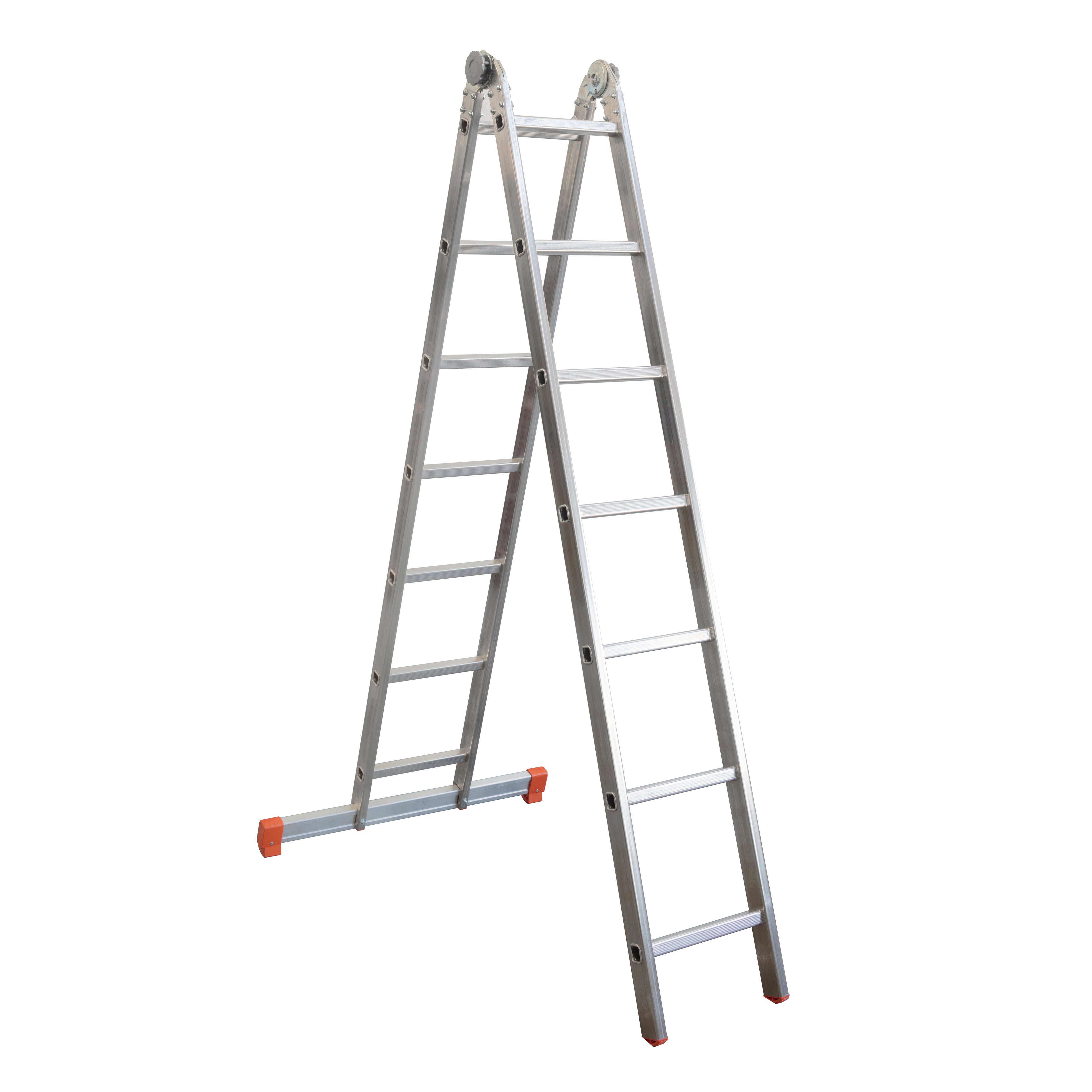Conforme a UNI EN 131. Ideale per uso professionale. La struttura in alluminio rende la scala resistente, leggera e facile da trasportare. Grazie alla barra stabilizzatrice puoi lavorare con stabilità su superfici differenti