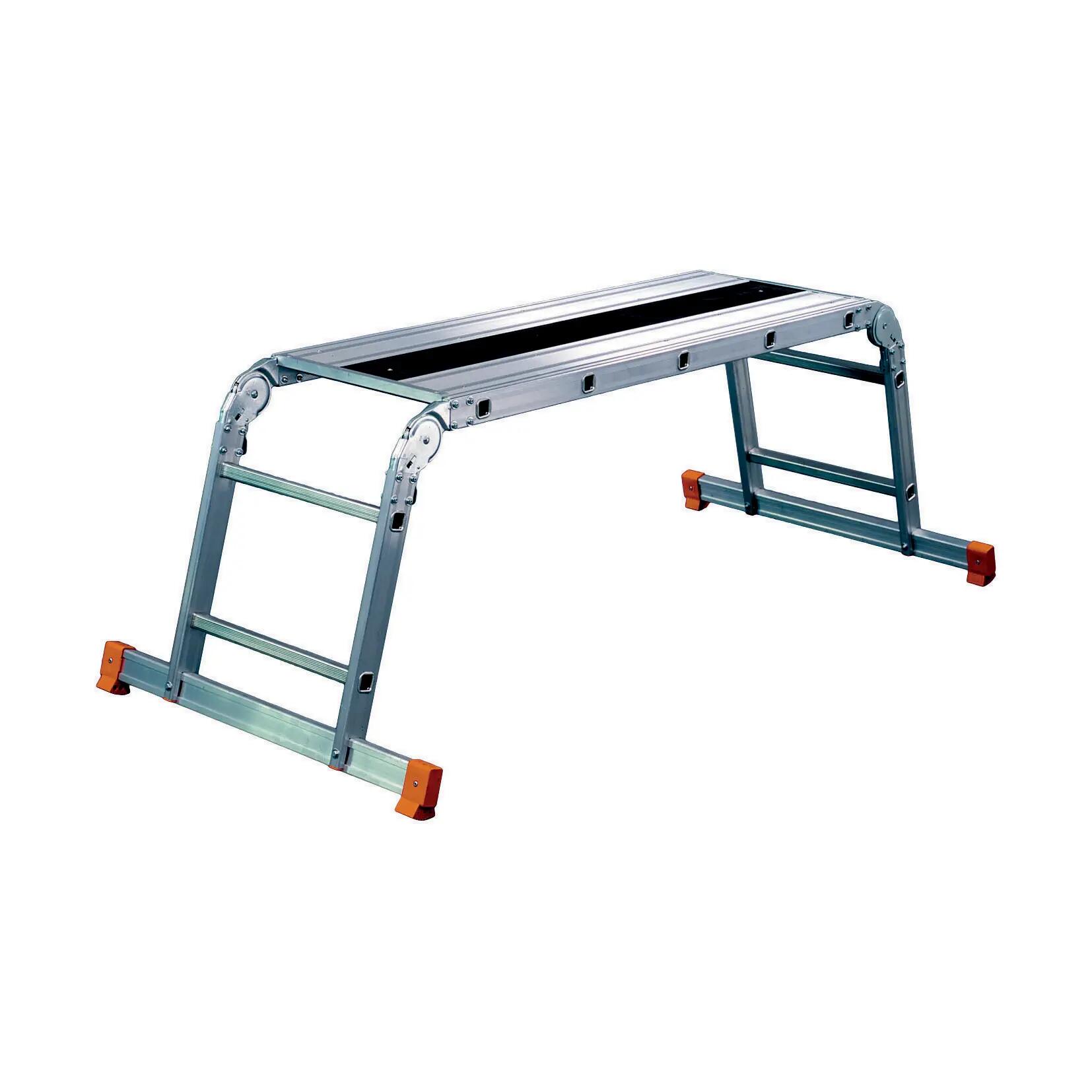 Pedana di 137cm. Conforme a UNI EN 131. Ideale per lavori in ambienti interni ed esterni. La struttura in alluminio rende la scala resistente, leggera e facile da trasportare. Grazie alla barra stabilizzatrice puoi lavorare con stabilità su superfici differenti. Compatta e facilmente trasformabile, puoi usarla sia come scala che come piano di appoggio