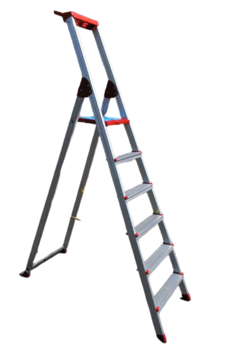 Scala professionale a 6 gradini in alluminio estruso a un lato di salita.. Dotata di comoda vaschetta porta utensili con gancio porta secchio. Piano ergonomico brevettato SICOS in materiale plastico alto resistenziale e gomma antisdrucciolo. Sezione profilo montante 51x20 mm. Sezione gradino 80 mm. Portata 150 kg. Normativa europea EN 131.